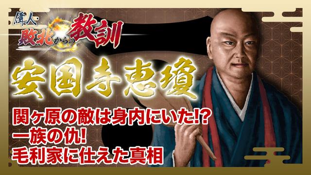 中国地方の大大名・毛利氏の外交僧として活躍した安国寺恵瓊の敗北から現代に通じる教訓を探る。1537年頃、安芸武田氏の一族として、安芸国に生まれたと考えられる恵瓊は幼い頃、一族が毛利元就によって滅ぼされたため、出家し、10代半ばで京都にある東福寺の高僧・竺雲恵心に師事。恵心と親交のあった毛利家に仕え、備中高松城の戦いで羽柴秀吉と講和交渉を行うなど、外交僧として名を上げる。