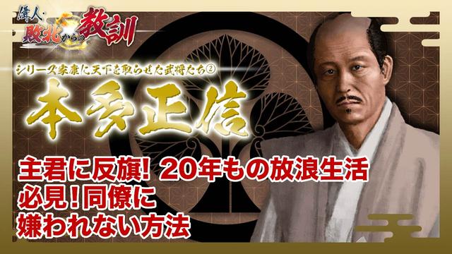 主君に背いた過去がありながら厚い信頼を獲得した名参謀・本多正信の敗北から明日を生きるための教訓を探る。1538年、三河国に生まれた正信は1560年、家康の家臣として桶狭間の戦いに参加したが、3年後、三河一向一揆が起きると、一揆勢に加担し、家康に激しく抵抗した。1582年、帰参した正信は内政や外交など幅広い分野で才能を発揮。1590年、家康が関東に移封されると、相模玉縄1万石の大名となった。