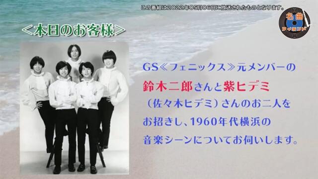 横浜の寺内企画に所属し、GS時代に「寺内タケシとバニーズ」の弟バンドとして活躍した伝説のグループ「ザ・フェニックス」のメンバーだった鈴木二郎と佐々木ヒデミの2人が今回のゲストです。