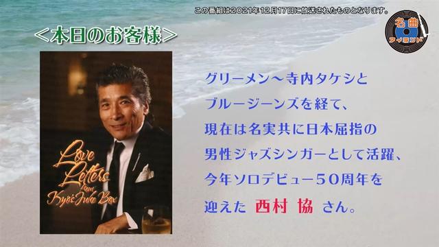 今回のゲストは≪寺内タケシとブルージーンズ≫のボーカルを経て、現在はソロシンガーとして50周年を迎え、ジャズ界で活躍する西村協さん。