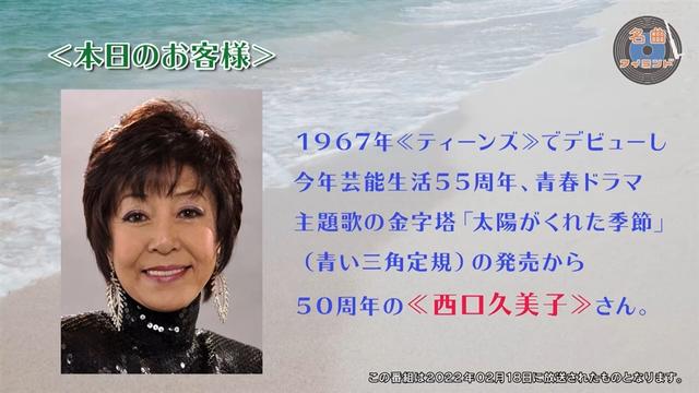 今回のゲストは西口久美子さん。1960年代後半のGSブームの中、ダンスチーム<ティーンズ>の一員として芸能界デビュー。番組アシスタントのMamiもこのグループに遅れて加わり、GS番組、歌番組のバックダンサーとして活躍しました。その後<ティーンズ>の後身<ハニーポピーズ>を経て、作曲家・いずみたく氏に見出され、3人組<青い三角定規>を結成、ドラマ主題歌「太陽がくれた季節」がヒットし、NHK「紅白」にも出場。