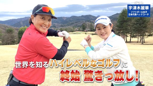 ゲストはソフトボール女子日本代表ヘッドコーチの宇津木麗華さん。ゴルフ歴は約5年でベストスコアは80。日本女子ゴルフの礎を築いた名選手岡本綾子プロとも親交があり、一緒にラウンドするという宇津木さんへのリプレイレッスンは「左足下がりのロングショット~ライン出しのセットアップとテークバック~」。
